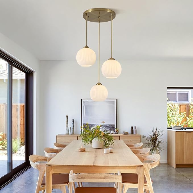 - Modern and Classic Design: This modern 3-light ceiling light features white striped bottom opening glass shade and gold finish treatment, combination of various popular elements, presenting a variety of matching styles. The antique brass pendant light is an ideal choice for projects seeking a timeless yet contemporary aesthetic
