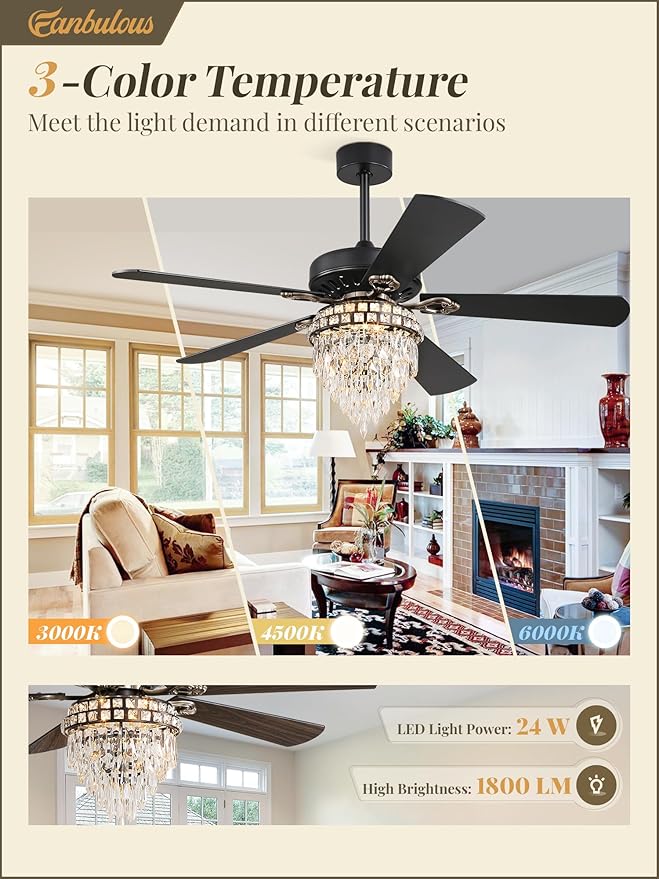 - Farmhouse Ceiling Fan: The chandelier ceiling fan features high-transparency K9 crystal, making the light shine as brilliantly as the stars. The blades are elegantly adorned with bronze metal brackets, adding a touch of vintage charm. Each blade offers dual color options - a classic black finish on one side and a warm wood grain tone on the other, perfect for blending into modern or farmhouse style settings