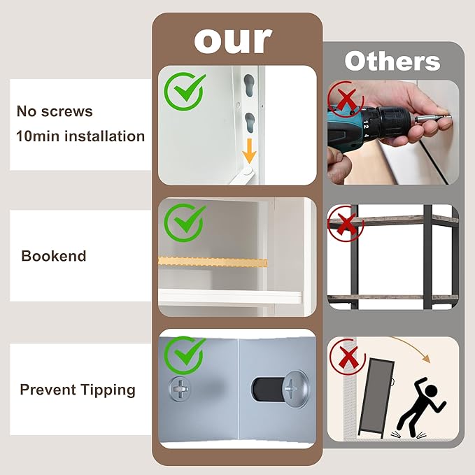 - 【No Screws Assembly】The white book shelf use snap fittings install design, which makes the structure more stable. No need for screws or tools, and no need for great hand skills. Easy-to-understand manual and video instructions help you install the white bookcase quickly in 10 minutes.