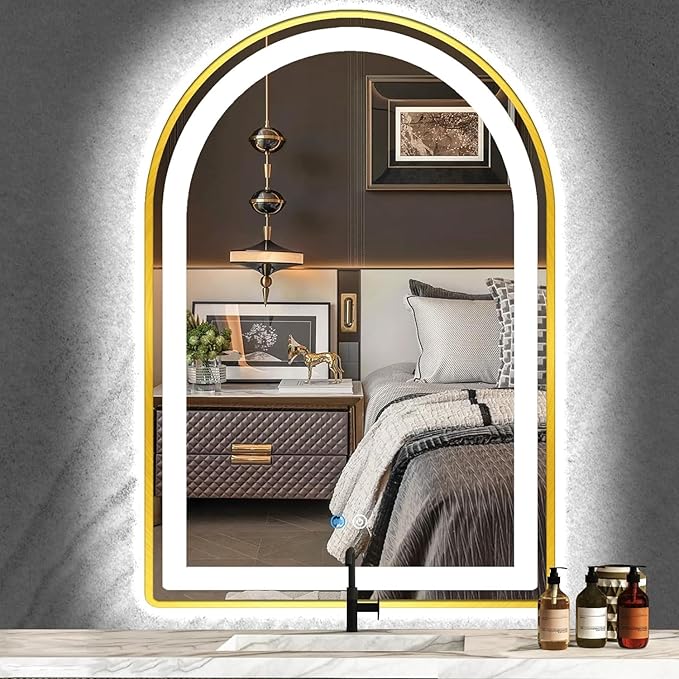 24 x 32 Inch Gold Arch LED Lighted Vanity Mirror for Bathroom Wall Makeup Desk Table Gold Arched Mirror with Lights AntiFog 3 Color Dimmable Bathroom 32in Gold Arched Smart Light up Mirror