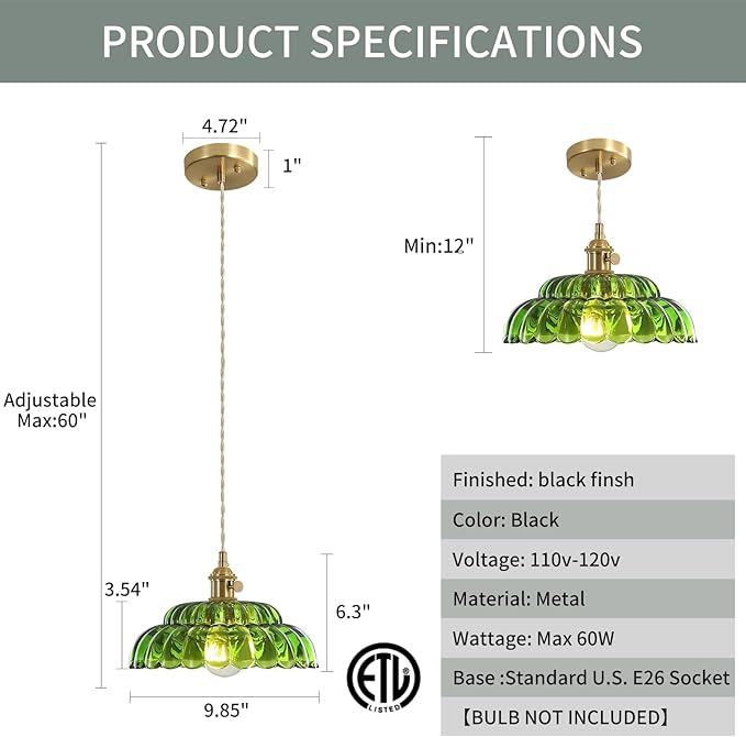 - Lighting Requirement: This kitchen island lighting uses E26 socket, Max 60W, it is compatible with all kinds of E26 bulbs: LED, Incandescent, CFL, Halogen. (Bulb Not Included)