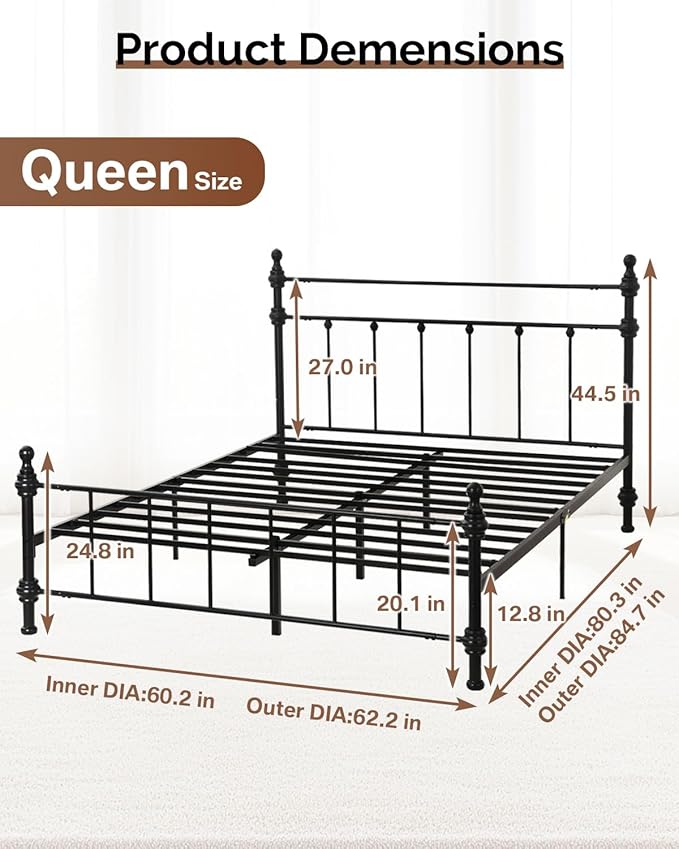 - 【Queen Size Bed Frame】This queen bed frame with arched headboard features luxury Roman column. Bed frame dimensions: 85"L x 62"W x 24"H. Maximum weight recommendation: 800 pounds.