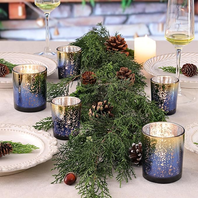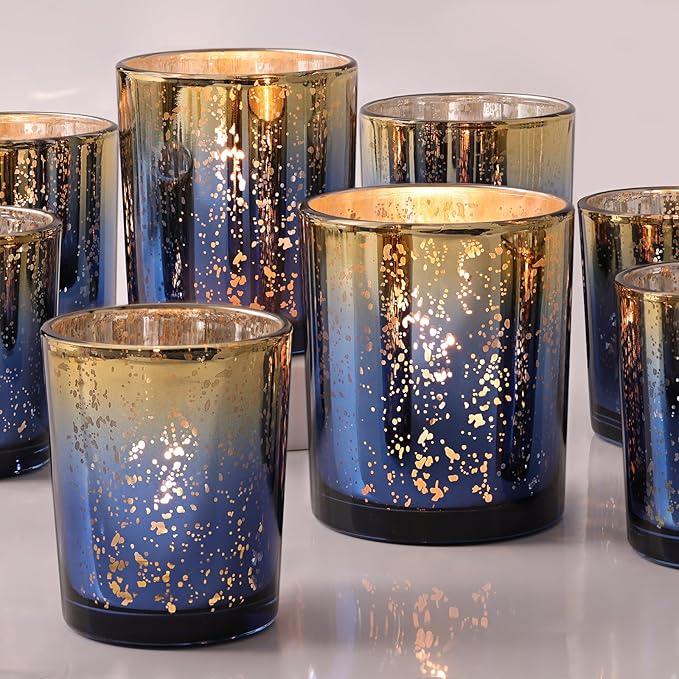 - DISTINCTIVE NAVY+GOLD DESIGN-- Giving a Gorgeous But Timeless Look: We chose to add gold to the top of the blue cup body to add a sense of sophistication, perfect for navy and gold-themed party decoration. Mercury speckled effect on the votive candle holders will enhance the natural warm light of candles, keep shining in your life. It can also be used as a vase to decorate your home.