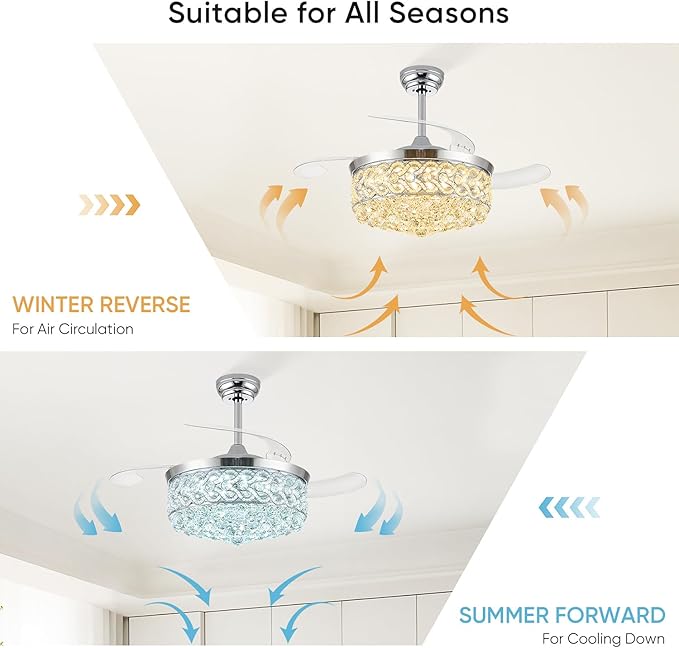 - REVERSIBLE DC MOTOR: Equipped with an upgraded DC motor, this crystal ceiling fan operates super-quietly while consuming 80% less energy than traditional AC motors, boasting an impressive lifespan of 5-10 years. The reversible function of this crystal fan keeps you cool in the summer and circulates warm air in the winter—all without any noise.