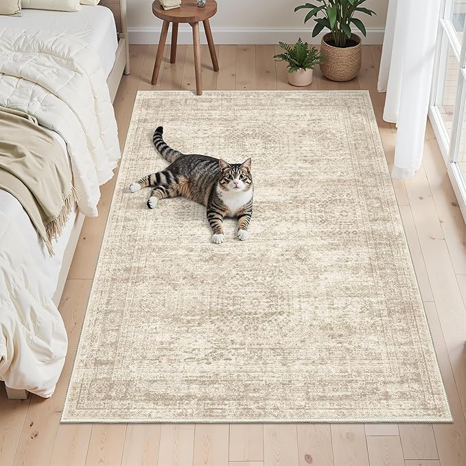 3x5 Rug, Small Area Rug for Kitchen, Entryway, Machine Washable Non-Slip Throw Rug, Vintage Carpet for Nursery Coffee Table Beige