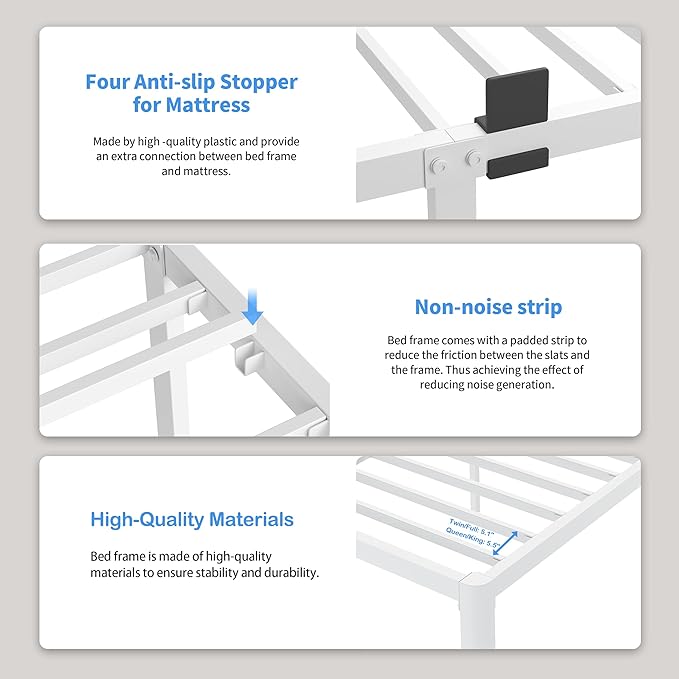 - Special Feature : 12.4 inch Storage Space Underneath, Anti-slip and Noise-free Rubber Pads, Headboard Hole Leg and Rounded Corner, No Box Spring Needed, Squeak Resistant 12.4 inch Storage Space Underneath, Anti-slip and Noise-free Rubber Pads, Headboard Hole Leg and Rounded Corner, No Box Spring Needed, Squeak Resistant