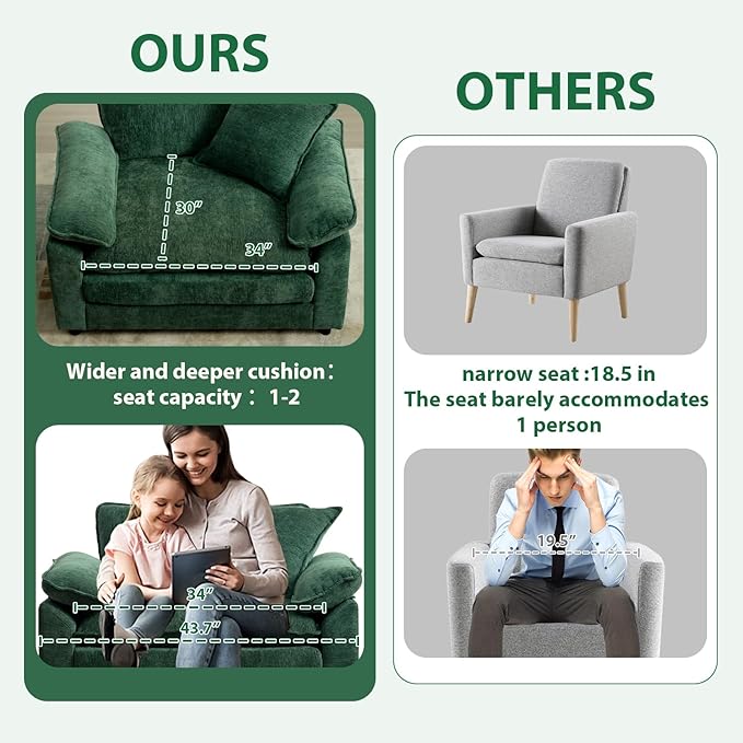 - Oversized Dimensions✅ Accent chair measuring 43“(L)*29.5" (W)*34.6"(H) , this size offers spaciousness suitable for users of all body types. Whether for leisure relaxation, focused reading, or enjoying TV shows, it delivers unparalleled comfort. The thickened and deepened seat allows complete relaxation.