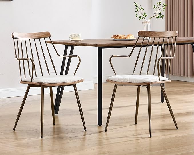 HNY Mid Century Modern Dining Chairs Set of 2, Beige Linen Upholstered Dining Room Chairs with Arms & Metal Legs Farmhouse Spindle Back Kitchen Chairs, Industrial Accent Side Armchairs for Living Room