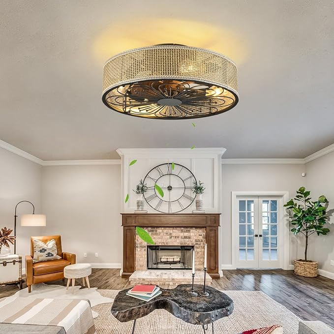 Modern Boho Rattan Flush Mount Ceiling Fans with Lights and Remote Control Low Profile Bladeless Ceiling Fan Timer and 6-Speed Reversible Motor for Bedroom, Kitchen, Dining Room Include Bulbs