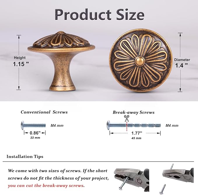 - Quantity and Packaging: Pack of 10 antique brass cabinet knobs. Each knob is individually wrapped in a foam bag, and all the knobs and screws are packed in a kraft paper box to prevent the knobs from being scratched.