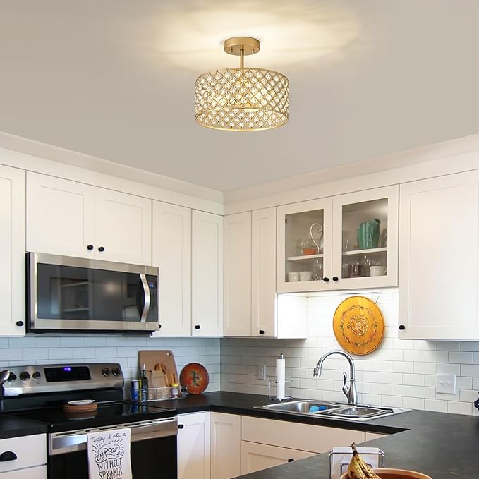 - Size and Materials: The crystal semi-flush mount ceiling light measures 12 inches in diameter and 10.5 inches in height. This crystal ceiling light is finely made, with a solid and long-lasting structure