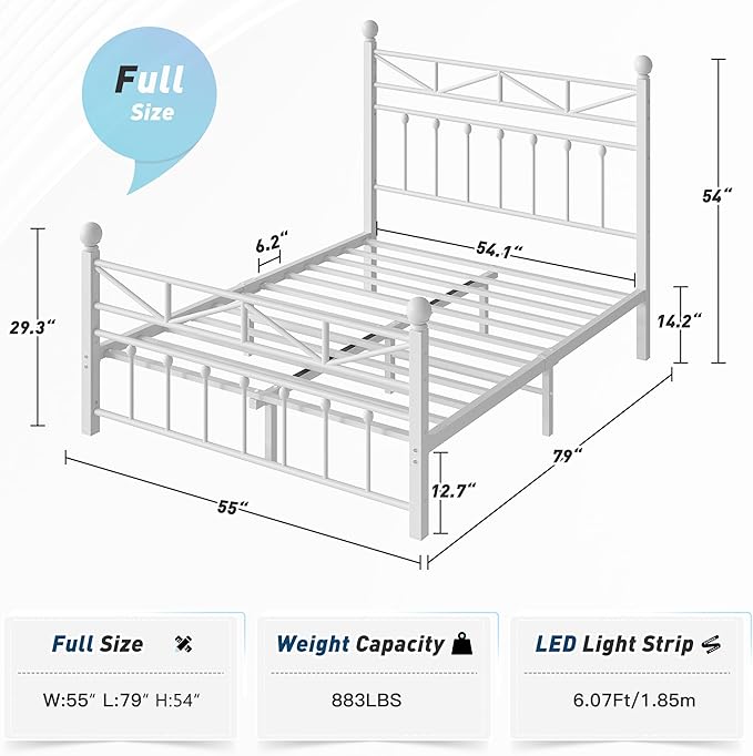 EnHomee 54" Metal Full Size Bed Frame with Tall Headboard & Footboard, LED Light Full Bed Frame, Strong Metal Slats Support and Noise-Free Design with Under Bed Storage/No Box Spring Needed/White