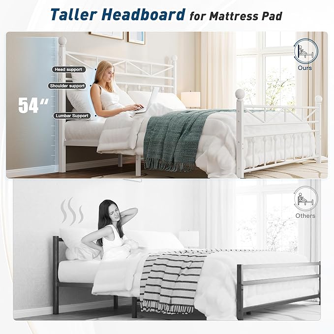 - 【54" Tall Headboard】The metal bed frame has a 54" tall headboard suited for any modern decor room, also ideal for high-ceiling rooms. It keeps mattress securely in place without slipping. You can prop soft pillows behind your back and read books or watch TV lazily.