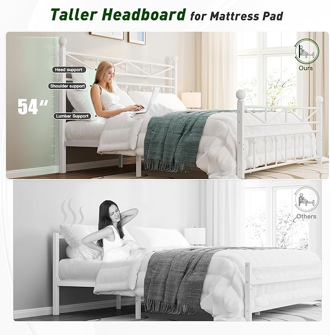 - 【54" Tall Headboard】The metal bed frame has a 54" tall headboard suited for any modern decor room, also ideal for high-ceiling rooms. Can stay mattress securely in place without slipping. You can prop soft pillows behind your back and read books or watch TV lazily.