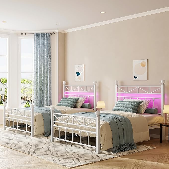 EnHomee 54" Metal Twin Bed Frames with Tall Headboard & Footboard, LED Light Twin Bed Frame, Strong Metal Slats Support and Noise-Free Design with Under Bed Storage/No Box Spring Needed/White