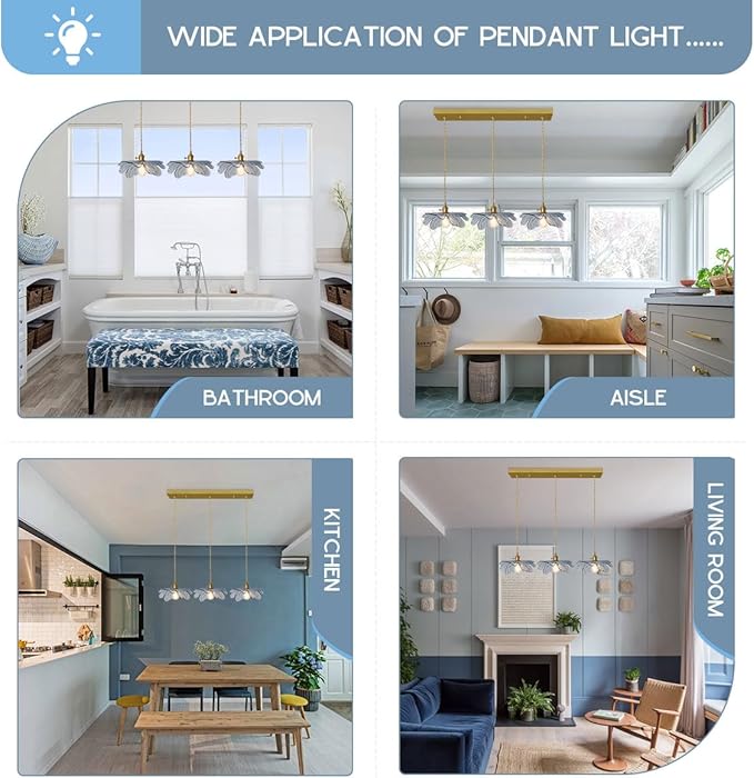 - 3 Light vintage Pendant Lights: his kitchen pendant light features an art deco look but also a fresh farmhouse style.Accessorized with an Thick glass lampshade and a vintage brass base. The golden light cord can bring your space a noble feeling.