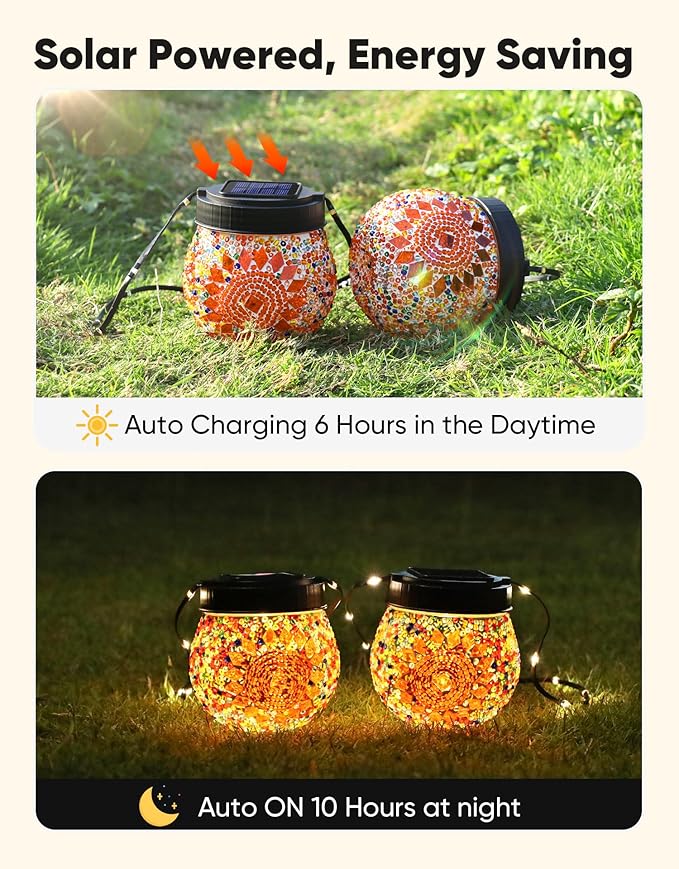 - Art Decor: Exquisite handmade crafts make the lantern gorgeously, It looks high-end and mysterious. Sparkling mosaic solar light is a perfect decoration for anywhere. The 10 LED beads in the handle like fireflies in the dark.