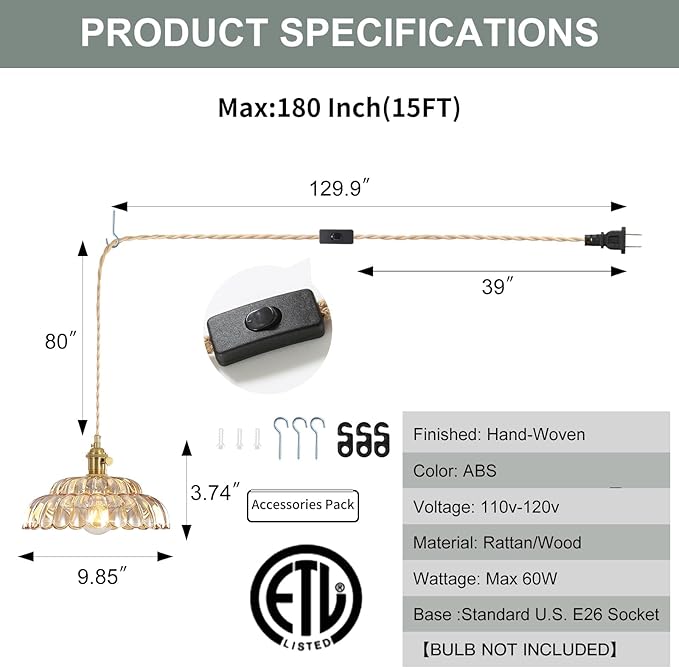 - Excellent Material: This pendant light has a metal base and glass shade, the rubber coating wire covered with fabrics, the shade is textured and the body is sturdy and durable.