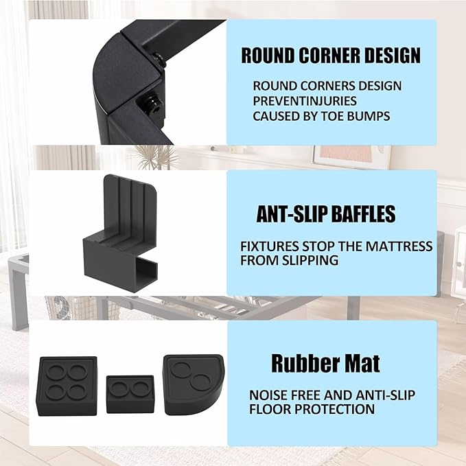 - Special Feature : No Box Spring Needed, Headboard Hole Leg and Rounded Corner, Anti-slip and Noise-free Rubber Pads