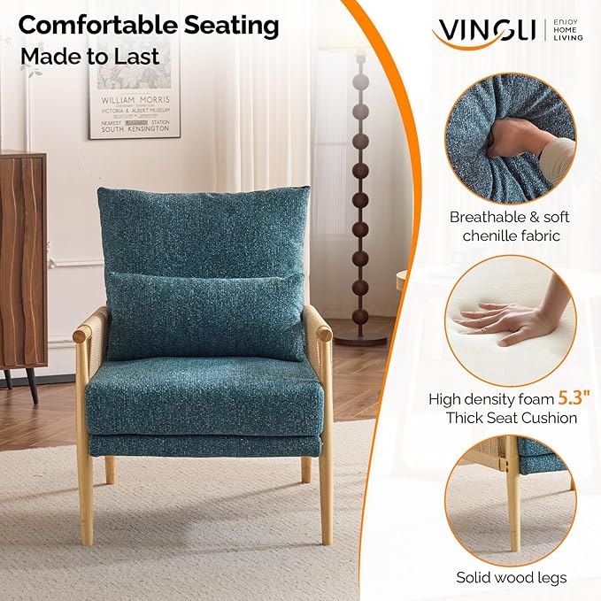 VINGLI Boho Braid Accent Armchairs Set of 2,Mid-Century Modern Chiars with Solid Wooden Armrest,Comfy Louge Cushion Chairs with Waist Pillow for Bedroom,Living Room,Reading Room, Teal