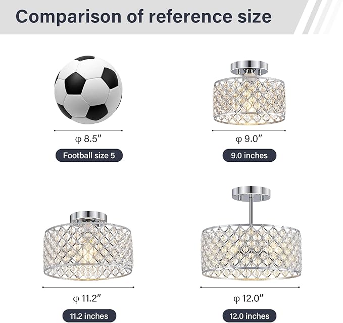 - Size and Materials: The crystal semi flush mount ceiling light measures 9 inches in diameter and 7 inches in height. This crystal ceiling light is finely made, with a solid and long-lasting structure