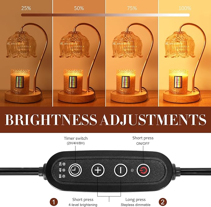 - 【Adjustable Brightness & Temperature】Featuring four dimmable settings, allowing for precise adjustment of the wax melting speed.Adjusting to a higher brightness setting accelerates the release of fragrances. Package includes two 50W bulbs.(Candles not included.)
