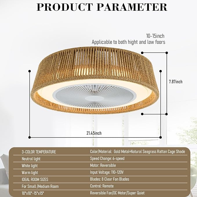 21" Boho Paper Rope Caged Ceiling Fan with Lights Remote,3-Color Temperature Fan with Light and Reversible Motor,LED Rattan Chandelier Ceiling Fan for Bedroom, Living Room