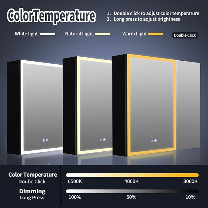 - 1、Dimmable 3 Colors Front & Bottom Light: Easily adjust the brightness and color temperature of the lights to create the perfect ambiance for your bathroom, whether you need bright lighting for grooming or a softer glow for relaxation.