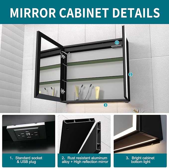 - 3、Built-in Sockets & USBs: Conveniently charge your devices or power toiletries without cluttering your countertops. This medicine cabinet with lights includes multiple sockets and USB ports for ultimate convenience.