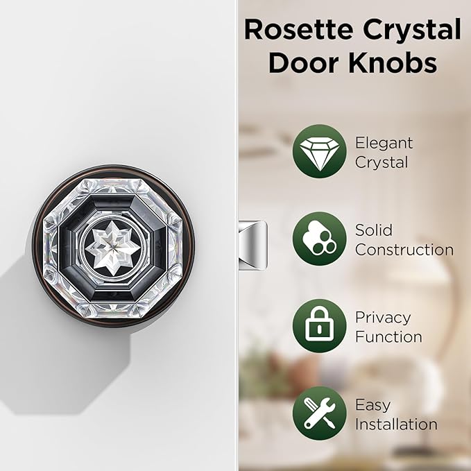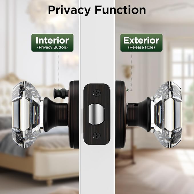 - Glass Door Knobs: comes with interior and exterior crystal door knob, Oil Rubbed Bronze plates.