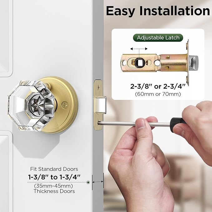 - Suitable Size: The glass interior door knobs are suitable for left/right hand doors, latch can be adjusted to 2 3/8 or 2 3/4 inch (60mm or 70mm), suitable for door thickness 1 3/8 to 1 3/4 inch (35-45mm).