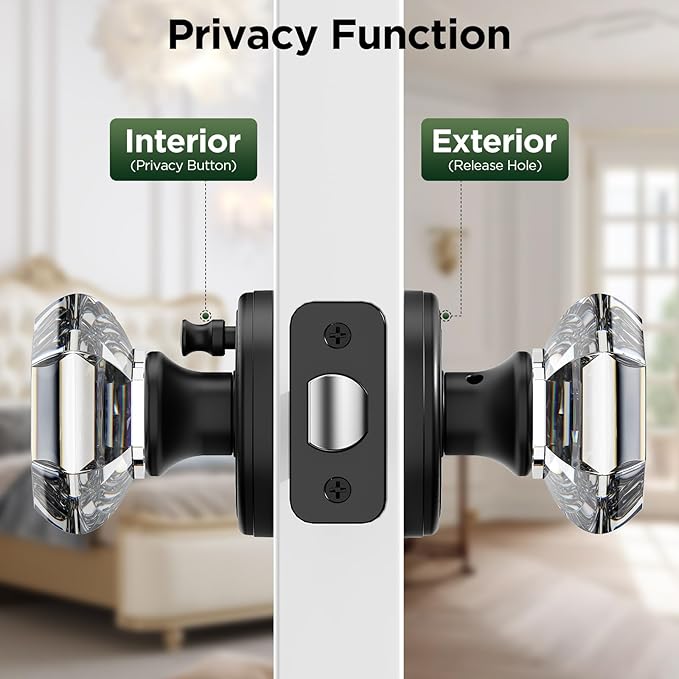 - Glass Door Knobs: comes with interior and exterior crystal door knob, Matte Black plates.