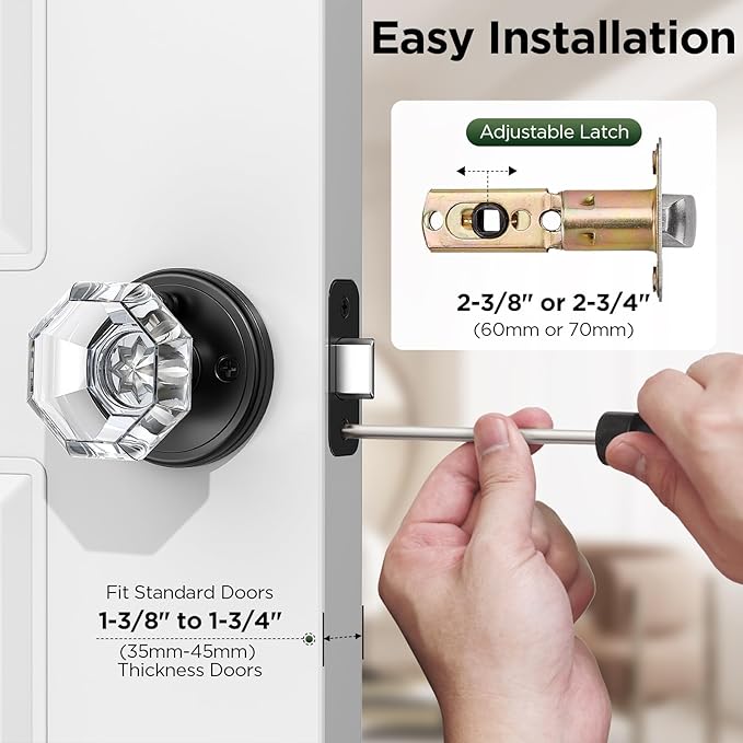 - Suitable Size: The glass interior door knobs are suitable for left/right hand doors, latch can be adjusted to 2 3/8 or 2 3/4 inch (60mm or 70mm), suitable for door thickness 1 3/8 to 1 3/4 inch (35-45mm).