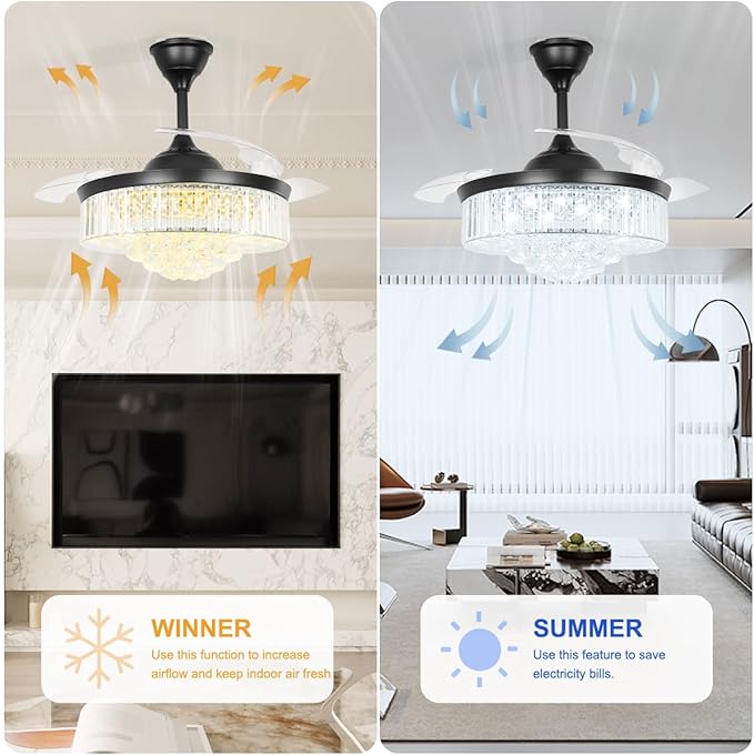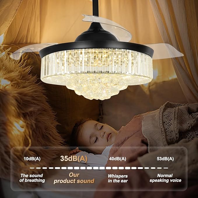 - This exquisite crystal fan-light (fandelier) seamlessly combines a crystal-adorned, dimmable ceiling fan, a powerful 72W LED panel, and a near-silent frequency motor, delivering complete year-round comfort.
