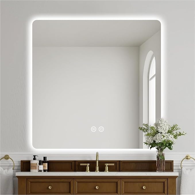 - 【Anti-Fog Feature】: The led mirror for bathroom has an anti-fog function using UL-certified anti-fog film. You won’t need to wipe the mirror, just turn on the anti-fog switch before a shower. To avoid forgetting to turn off the anti-fog feature, it automatically shuts off after one hour, making it more energy-efficient and safe.