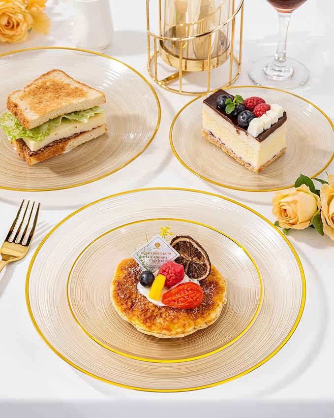 - Elegant Design: Immerse your events in an aura of timeless elegance with our clear gold plates. Modern swirl design platic plates gives people a noble and romantic feeling, it is very suitable for use in celebration banquet. Using our Brown plastic plates with gold trim will gives your guests a great experience.
