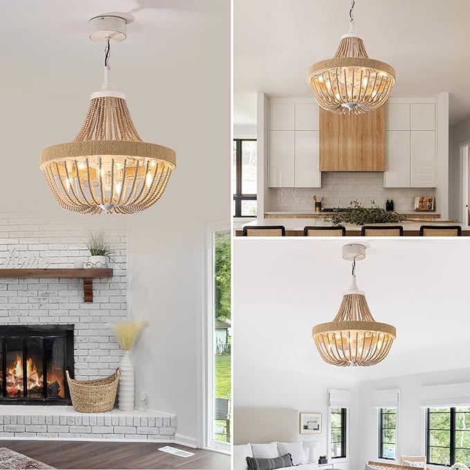 - Bohemian-Empire Fusion | Handwoven jute rope and 64 wood beads (32 top, 32 bottom) encircle a retro-inspired metal frame in antique white with gold accents. Elevates boho decor with Empire-era elegance