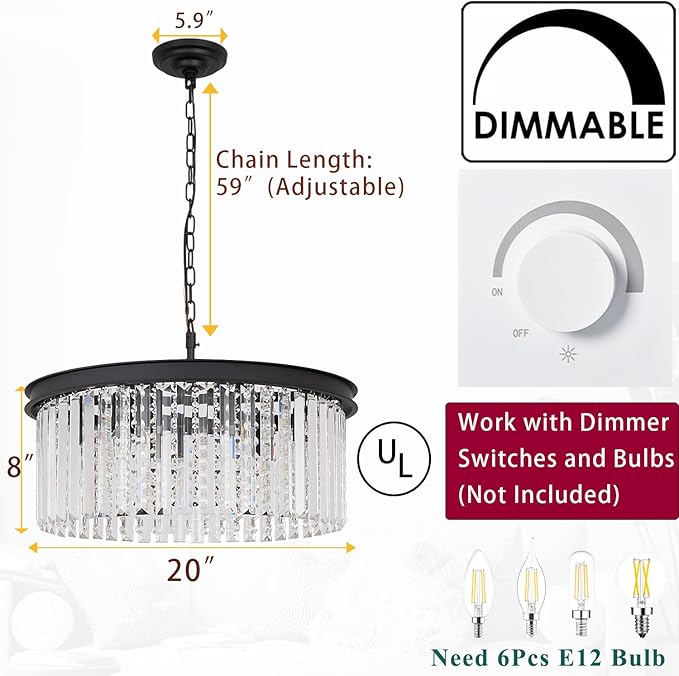 - 【Dimension】this round artistic chandelier light fixture is 20” diameter, Max adjustable height: 67’’, Min hanging height: 8’’, Light source: 8 x max-40w 110v E12 bulbs(Bulbs Not Included), compatible with LED/CFL/incandescent/vintage filament. It is dimmable with a compatible dimmer switch(Not included) and dimmable bulbs (Not included)