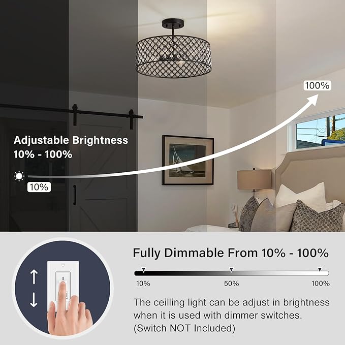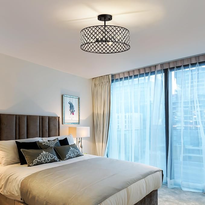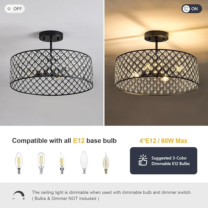 - High Translucency Crystal: The semi flush mount ceiling light comes wirh K9 crystal, the crystal material used allows for high light transmittance, with black light fixture metal frame, the ceiling light will refract luxurious and special light through the crystal to the surrounding of the ceiling