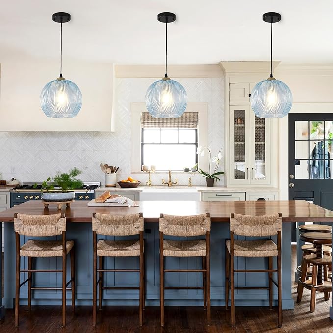 - Vintage Blue Pumpkin Pendant Light Design -- This globe pendant light fixture with diameter up to 9.84 inch features ribbed glass lampshade and a black ceiling canopy. The blue spherical glass shade is textured with leaf vein patterns designed with aesthetic appeal while the thickened material ensures a long-term durability, fitting right into traditional decor and modern farmhouses alike