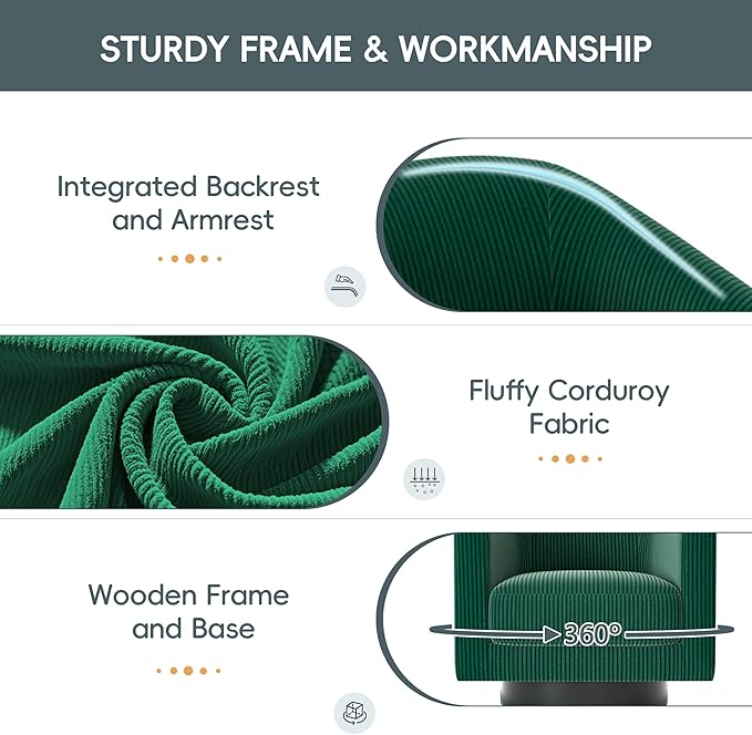 Swivel Accent Chairs, 360 Degree Bucket Chair, Modern Upholstered Barrel Armchair, Comfy Corduroy Single Sofa for Living Room Bedroom, Green