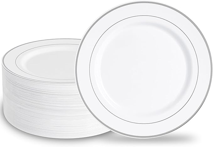 - PERFECT FOR ALL OCCASION: The white plastic plates with silver rim are simple and atmospheric, and are suitable for birthday parties, baby showers, dinner parties, weddings, barbecues, business gatherings, graduations, BBQs, family reunions, New Year's Day, and other special anniversaries. It is absolutely worth it