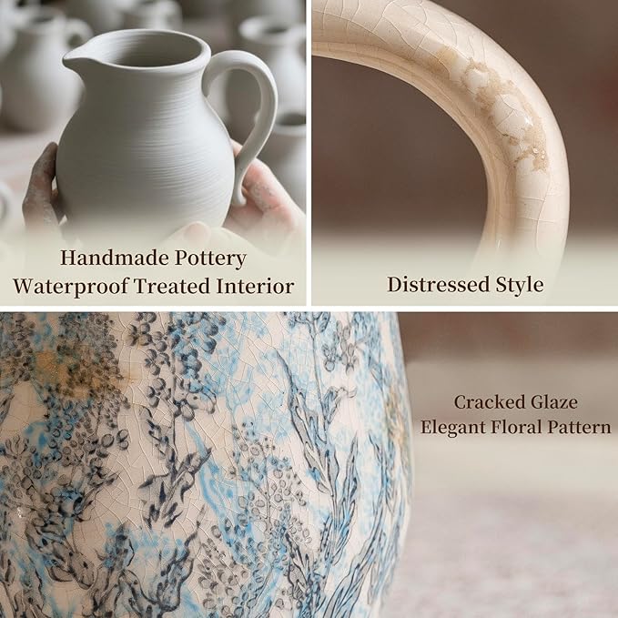Vintage Blue and Beige Floral Ceramic Vase with Handle, Retro Ice Glazed Crack Farmhouse Pitcher Vase for Home Decor, Living Room, Shelf, Office, French Country Decorative Flower Vase 8.7 Inch