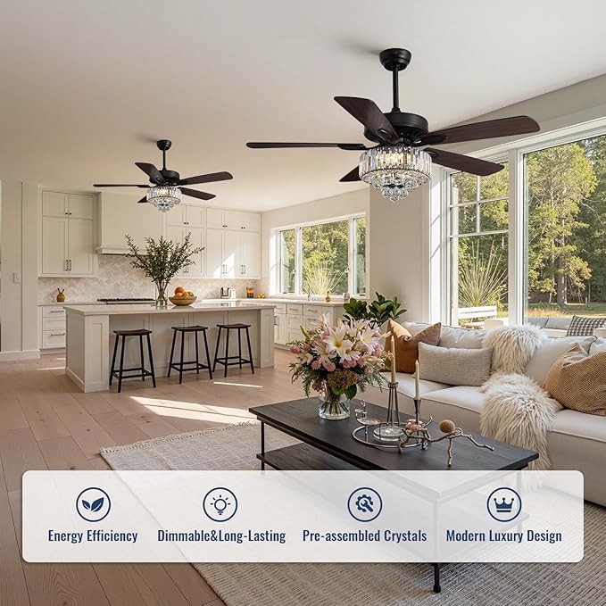 - 【Ideal Dimensions for Multiple Spaces】 With a 52-inch blade span and 22-inch total height (using the 5-inch rod), this fan fits beautifully in bedrooms, living rooms, dining areas, and kitchens. The package includes two downrods (5-inch and 10-inch) for flexible installation. The 12-inch crystal lampshade adds a refined touch to your decor