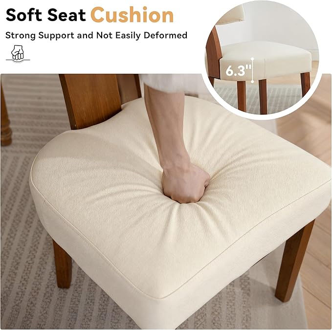- Comfortable Seat and Sturdy Construction: Each wood dining chair features a 6.3-inch thick, high-density cushion that provides exceptional support, ensuring all-day comfort. Upholstered dining chairs with sturdy hardwood legs and a 250-lb weight capacity, kitchen side chairs are built to withstand daily use while maintaining their sophisticated look.