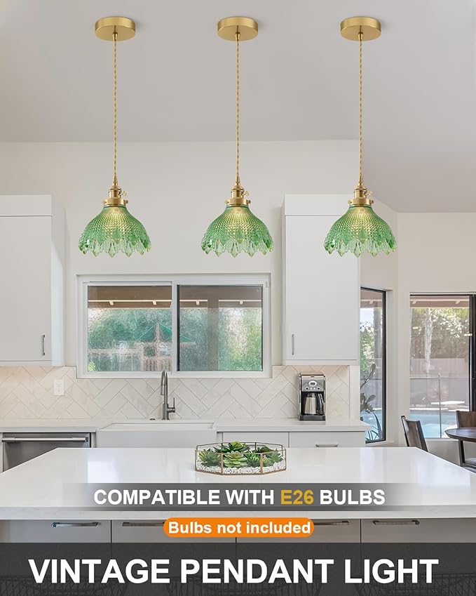 - 【Modern Vintage Floral Glass Pendant Light】This modern pendant light beautifully blends vintage charm with modern elegance. Featuring a floral-patterned thick glass shade and a brushed brass base, it casts a warm, romantic glow in your space. The clear version emits a soft, cozy ambiance, while the green option adds a fresh, natural aesthetic—enhancing the atmosphere with artistic flair and emotional warmth. A perfect touch of sophistication for your kitchen, dining area, or bedroom