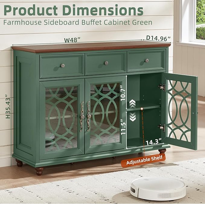 Farmhouse Sideboard Buffet Cabinet with Storage,48" Large Credenza with 3 Glass Doors & 3 Drawers,Adjustable Shelves Console Table,Wood Kitchen Coffee Bar for Dining Room,Living Room,Green