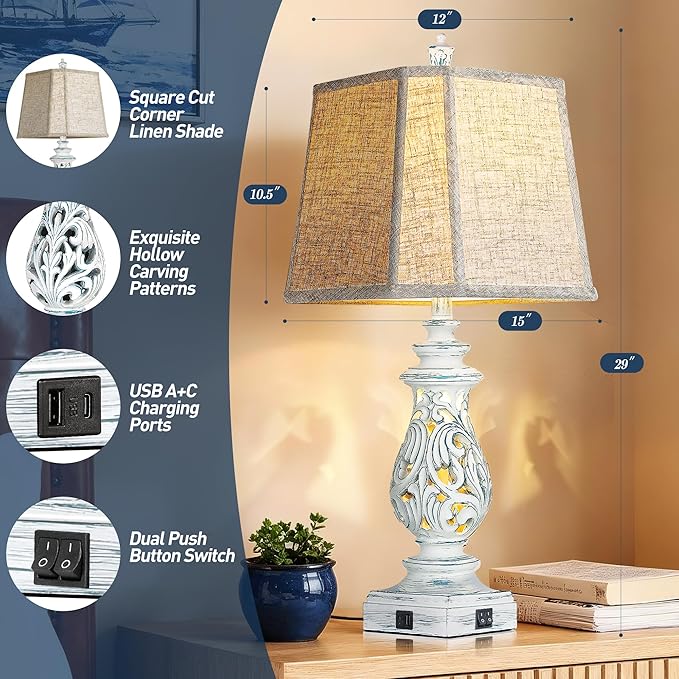 - USB A+C Charging Ports: Each lamp features 2 convenient USB charging ports. Charge two devices simultaneously – phones, tablets, e-readers – whether the table lamp is on or off. Super handy for your bedside essentials.