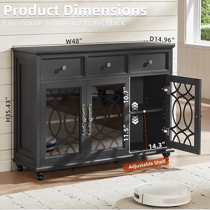 - [Farmhouse Buffet Cabinet]The sideboard cabinet measures 48'' W X 14.96'' D X 35.43''H. It combines an all-wood farmhouse design with an original natural texture, giving it a rustic and charming artistic quality. The combination of HD glass doors and wooden lines on the coffee bar cabinet is both functional and decorative, giving your home enough visual appeal.