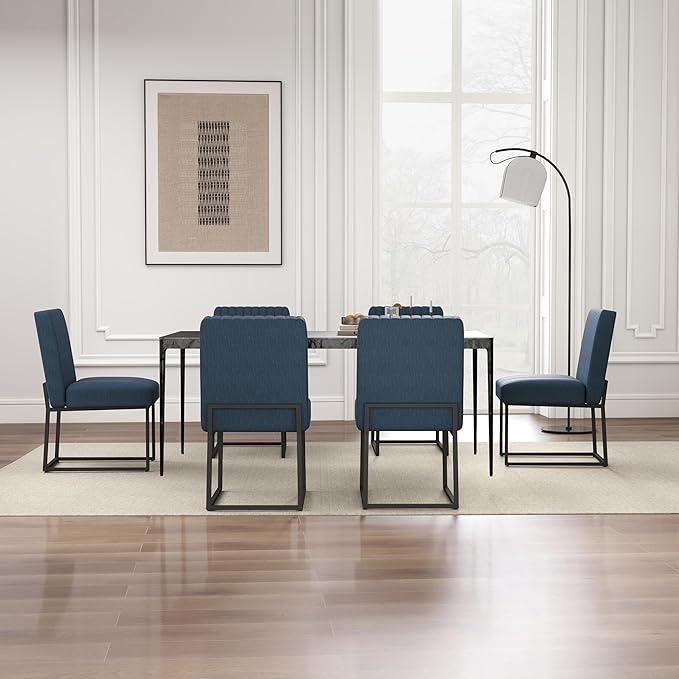 VKNOW Upholstered Dining Chairs Set of 6, Modern Dining Room Chairs with Stripe, Linen Kitchen Chair Dinner Chair with Black Metal Base for Kitchen Office, Blue